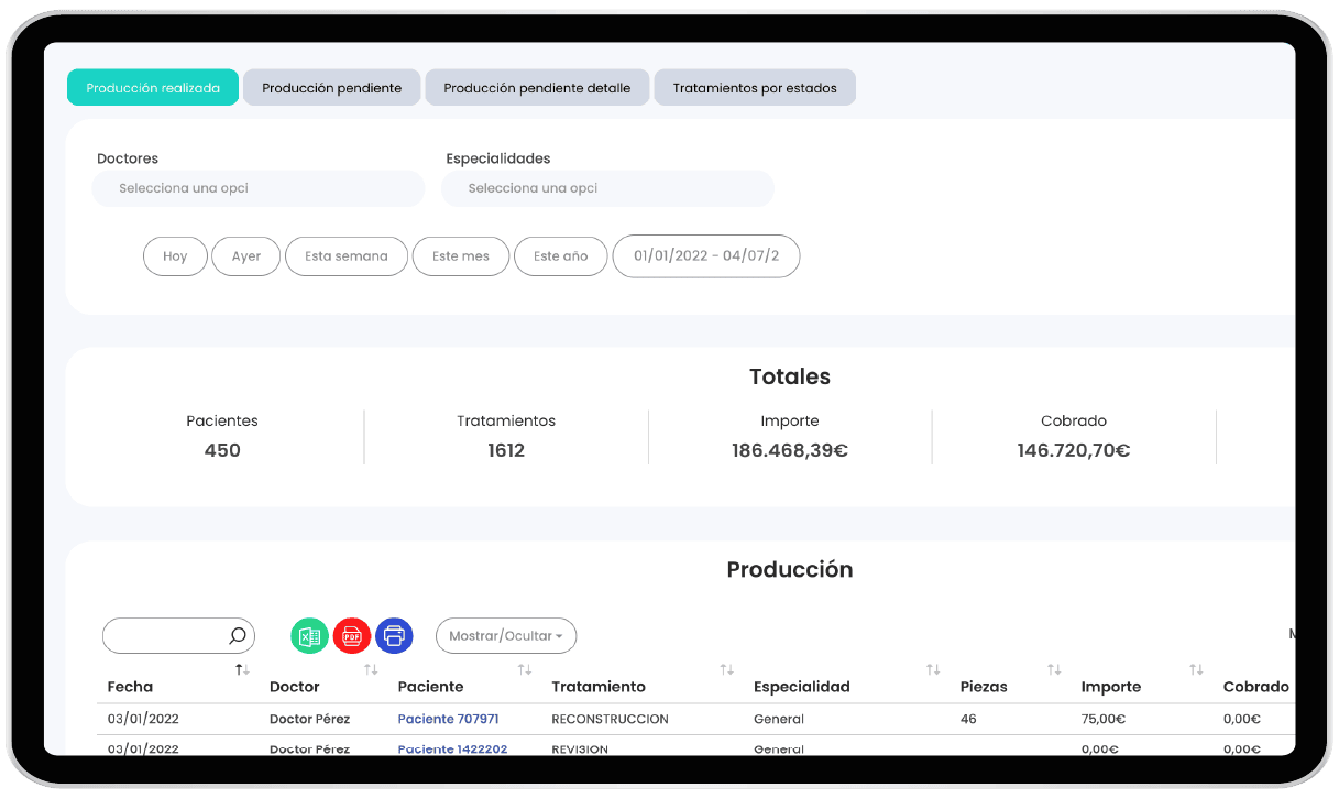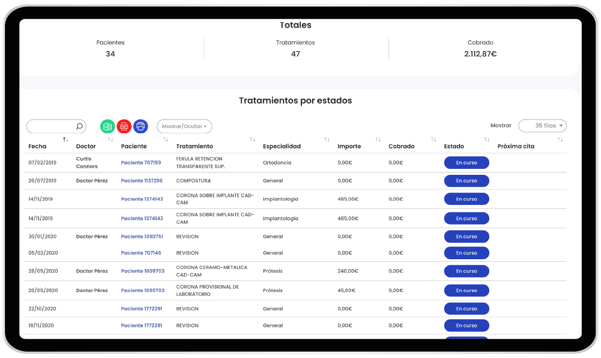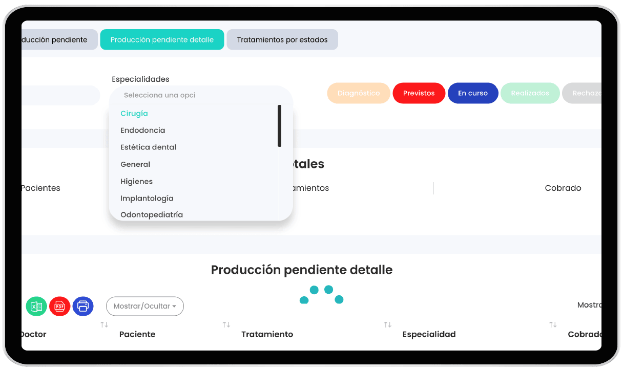 A través del programa de gestión, puedes ver con un click el dinero que pertenece a tratamientos no realizados, incluso cuánto dinero corresponde a cada especialidad.